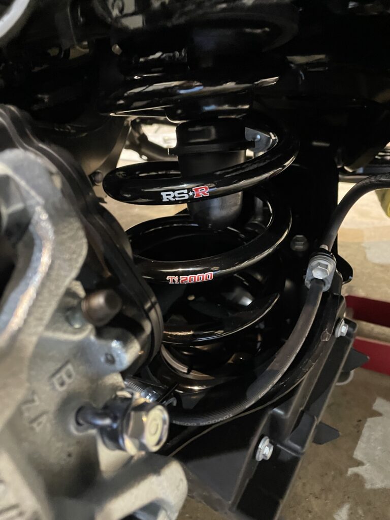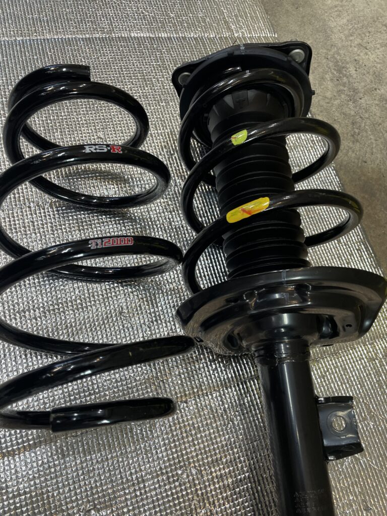 - ローダウンの施工です。今回は、大人の車高RSRのハーフダウンサスを組み込みます。過去に自分自身が色々な車高調など試してきましたが、最後は、このサスが、見た目や乗り心地などバランスが良く、今回ご相談の上この仕様にいたしました。