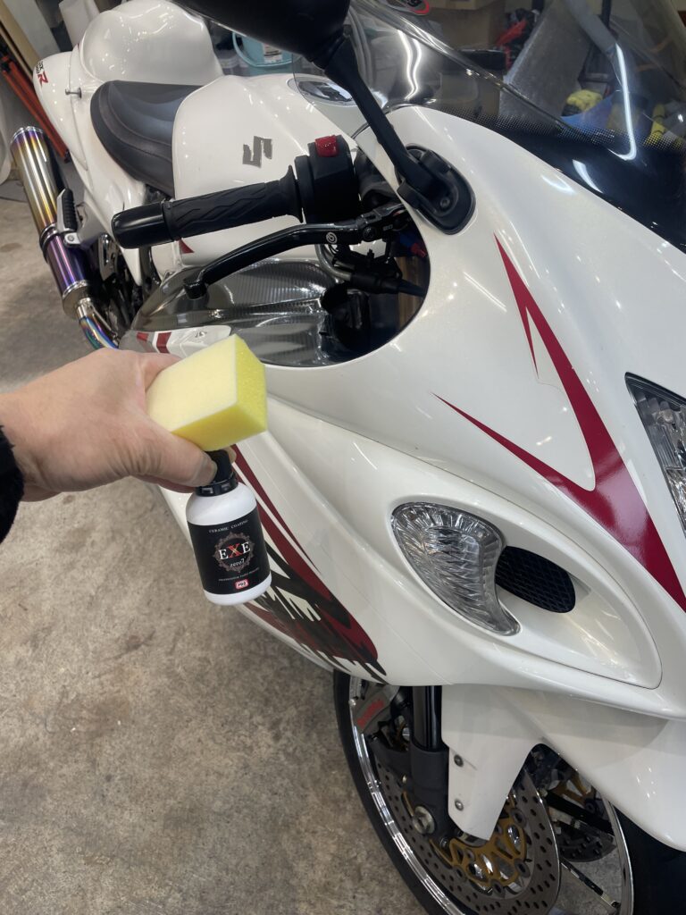 今回のバイク車両は、GSX1300Rへ研磨とセラミックコーティング(EXE zero7)、部分プロテクション、ホイールコーティングを施工しました。