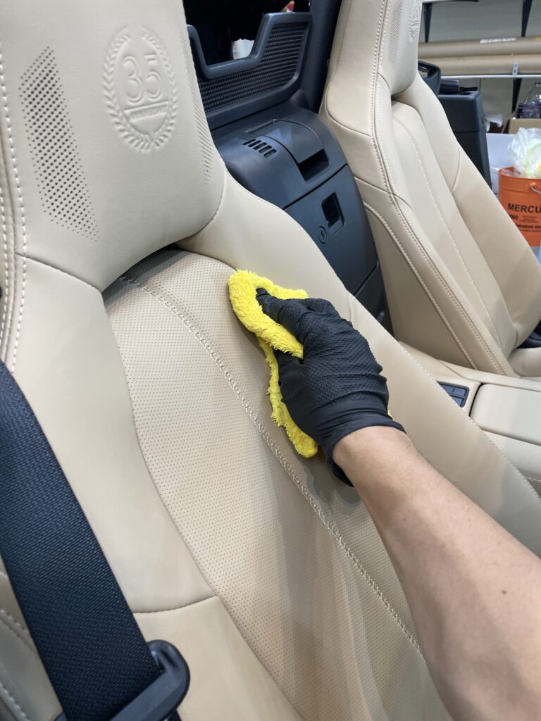 内装コーティングは、当社のインテリアコーティングをクリーニング後に施工します。触るところ触れるところ全てに塗布し、防水はもちろん、防汚、抗菌などの効果があり特に白い革シートは、汚れにくくなります。