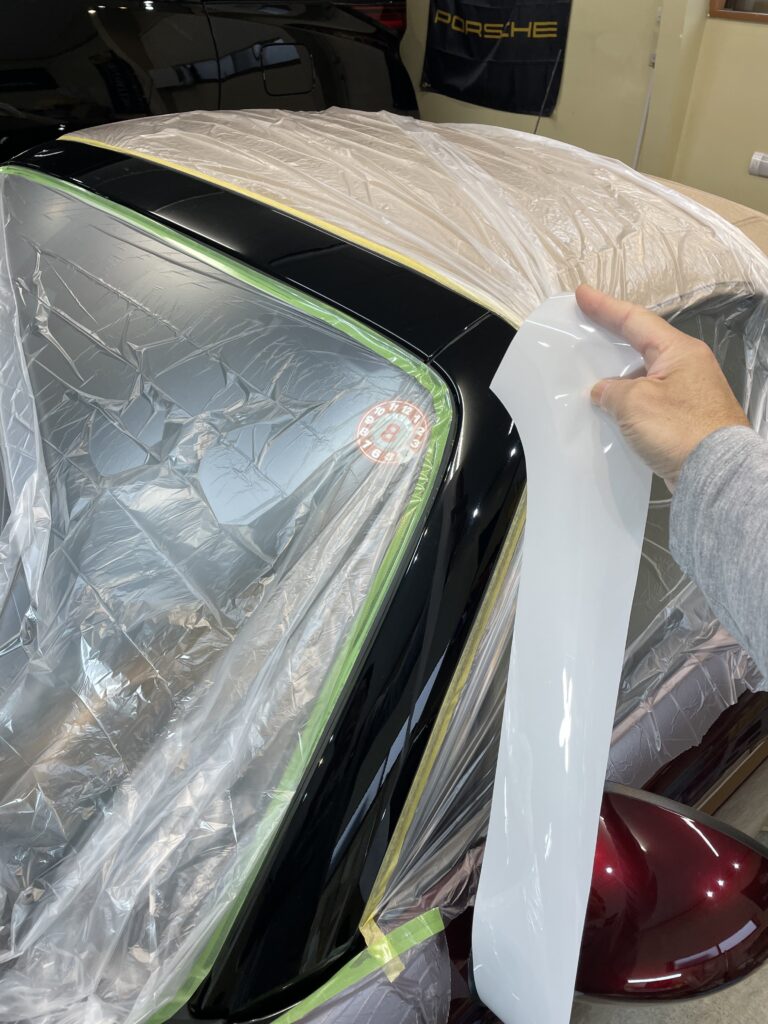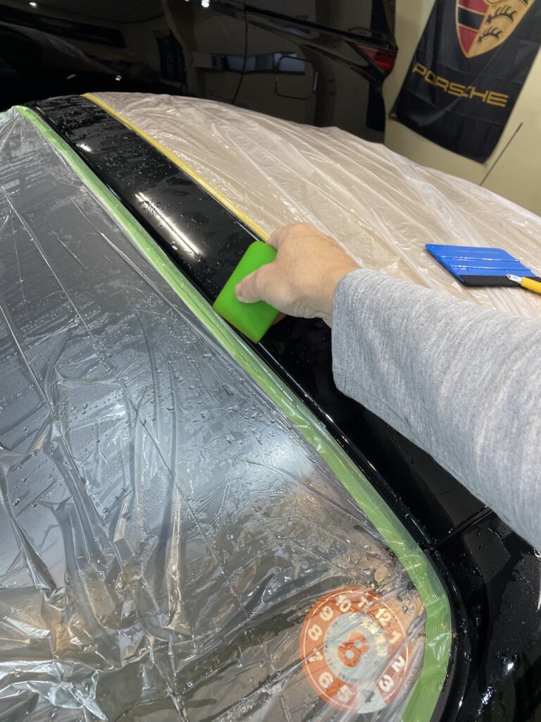 ルーフとピラー部分へプロテクションを貼ります。この部分だけブラックなので傷が目立ちやすいのと雨染みなどの対策もあり施工しました.