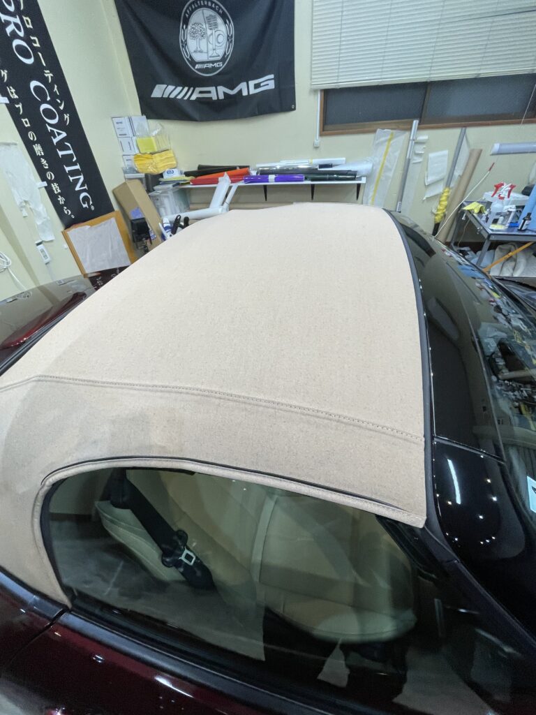 オープンカーの悩みで幌の汚れと劣化などに対して、有効的なのが、幌のコーティングです。今回、色がベージュの幌なので、黒カビなど発生すると黒くなってくるのでその前に、対策として施工しました。